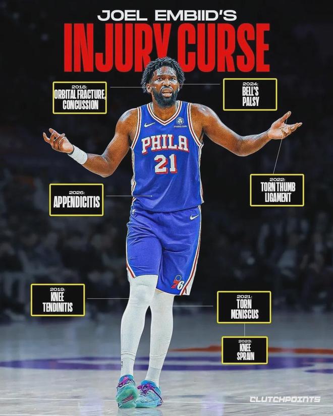 值得一提的是,前几天美媒Hoop Central统计了恩比德季后赛或季后赛前遭遇的伤病历,如下: