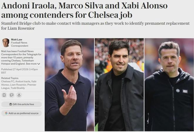 电讯报切尔西方面跟队记者ML消息,蓝军将在换帅进程中认真审阅伊劳拉、马尔科-席尔瓦以及阿隆索的条件,目前换帅程序还在早期阶段,但上述三人是斯坦福桥方面的目标人选。